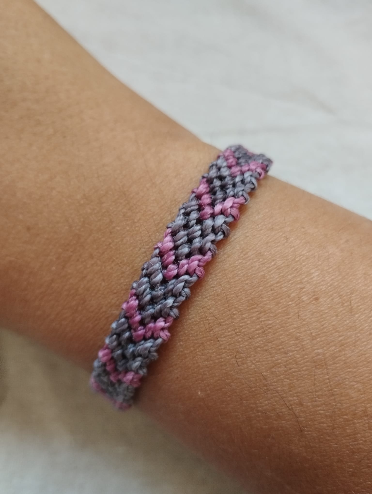 Pulsera hecha con hilo encerado, muy resistente, Grosor de 0,8 cm. En color rosa y morado.