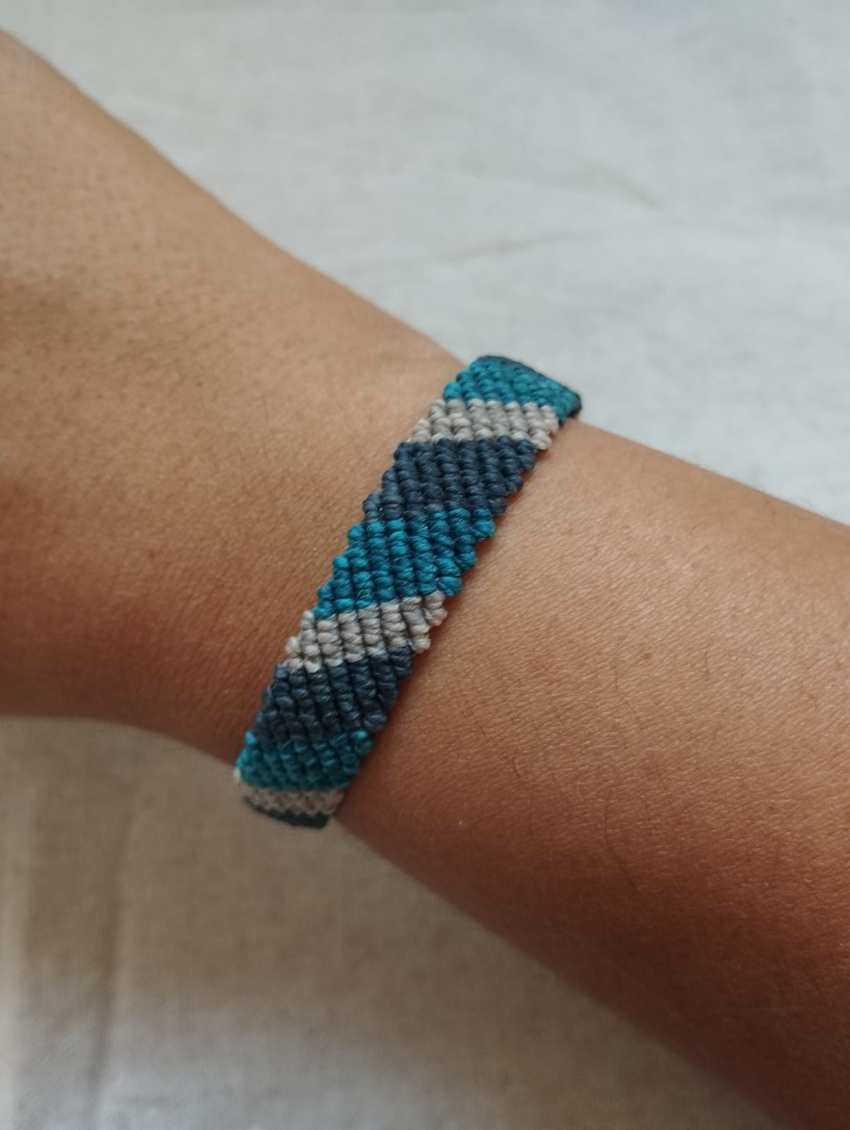 Pulsera de rayas de grosor aproximado de 1,3 cm. Cierre con nudo corredizo, para que la podáis poner y quitar. Los colores pueden variar ligeramente en las imágenes.